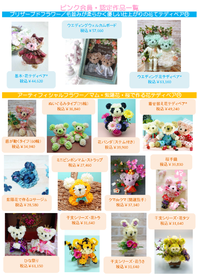 | 講座詳細 | □実技:12単位 (ベアは、プリザーブドフラワー・アーティフィシャルフラワーで制作/洋服はリボンで制作) □講義:5単位 (規約にいて/認定校について/講座の教え方について/正会員について/ピンク会員について) |
